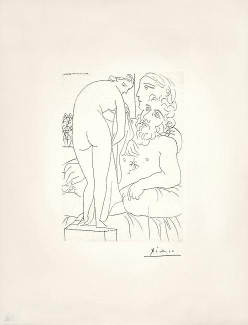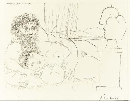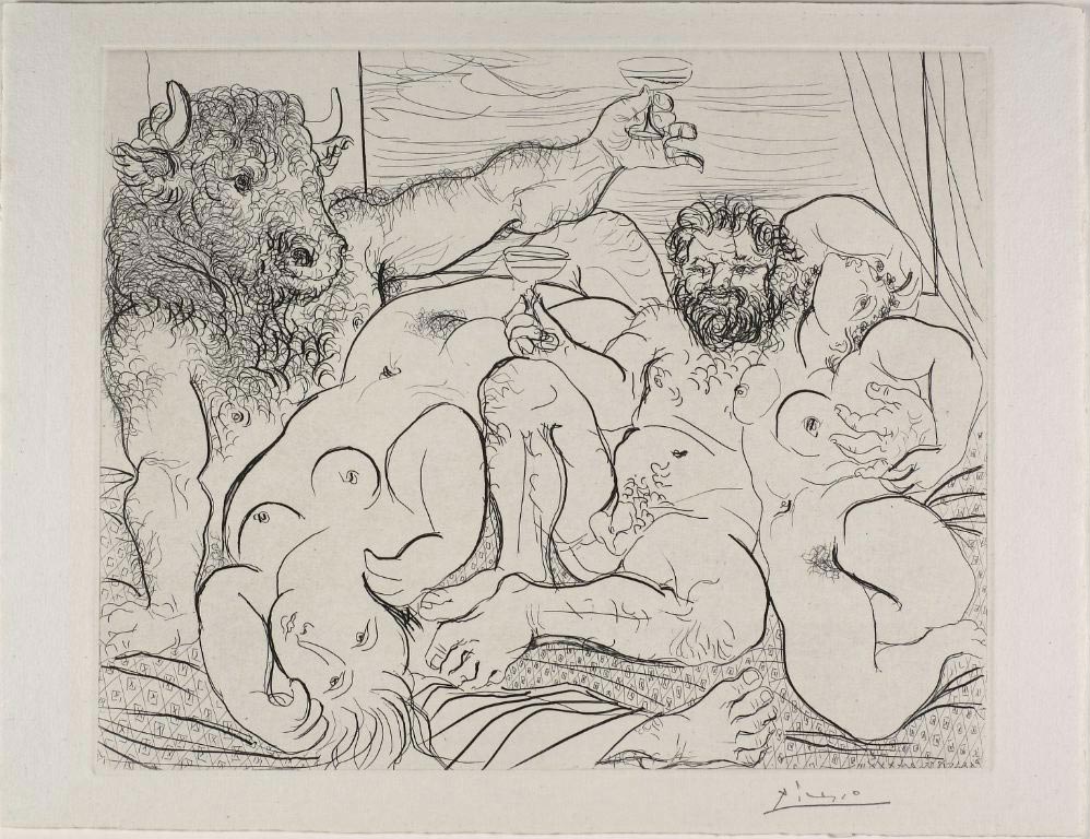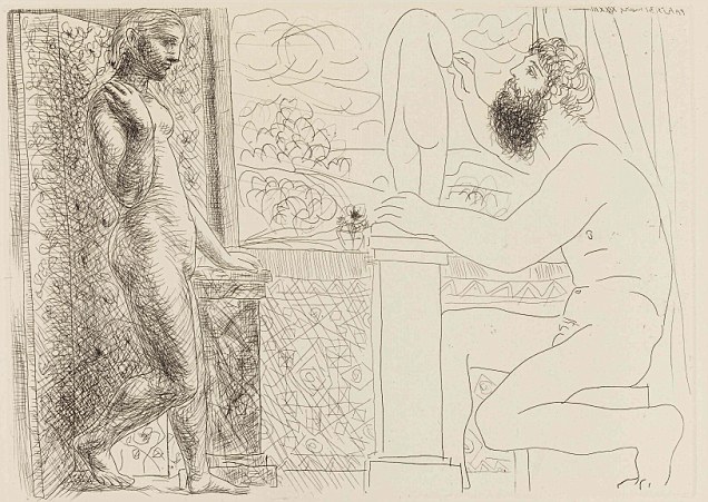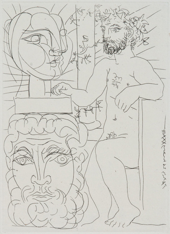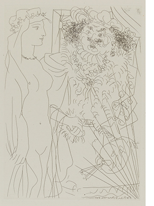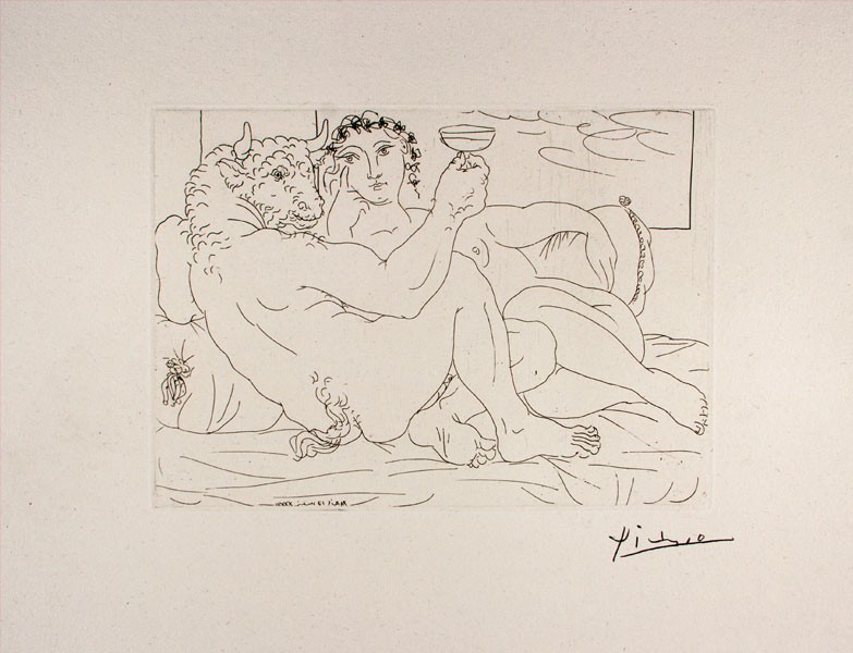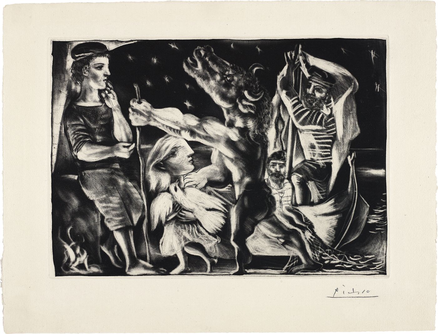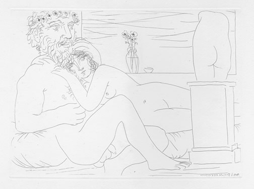 From 1930 to 1937, their love affair inspired one of the high points in Modern printmaking — a set of etchings that have come to be known as the “Vollard Suite.” They were named for the French art dealer, Ambroise Vollard, who commissioned them and gave Picasso his first Paris exhibition. Most of the one hundred etchings are set in a mythical sculptor’s studio along the Mediterranean. Filled with classical themes of love and passion, one subject is dominant — an artist and his adoring model living in paradise. At this time, Picasso and Marie-Thérèse were living in their new home and studio, the Château de Boisgeloup outside Paris.