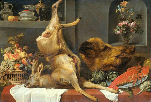 - Frans Snyders lived to 77 (1579-1657), A Basket of Fruit, a Buck, a Lobster on a China Plate, Artichokes and a Boar’s Head in a Tureen, Asparagus on a Draped Table, 1657