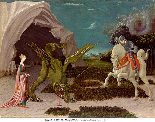 - Paolo Uccello lived to 78 (1397-1475), St. George and the Dragon, 1470. National Gallery, London.